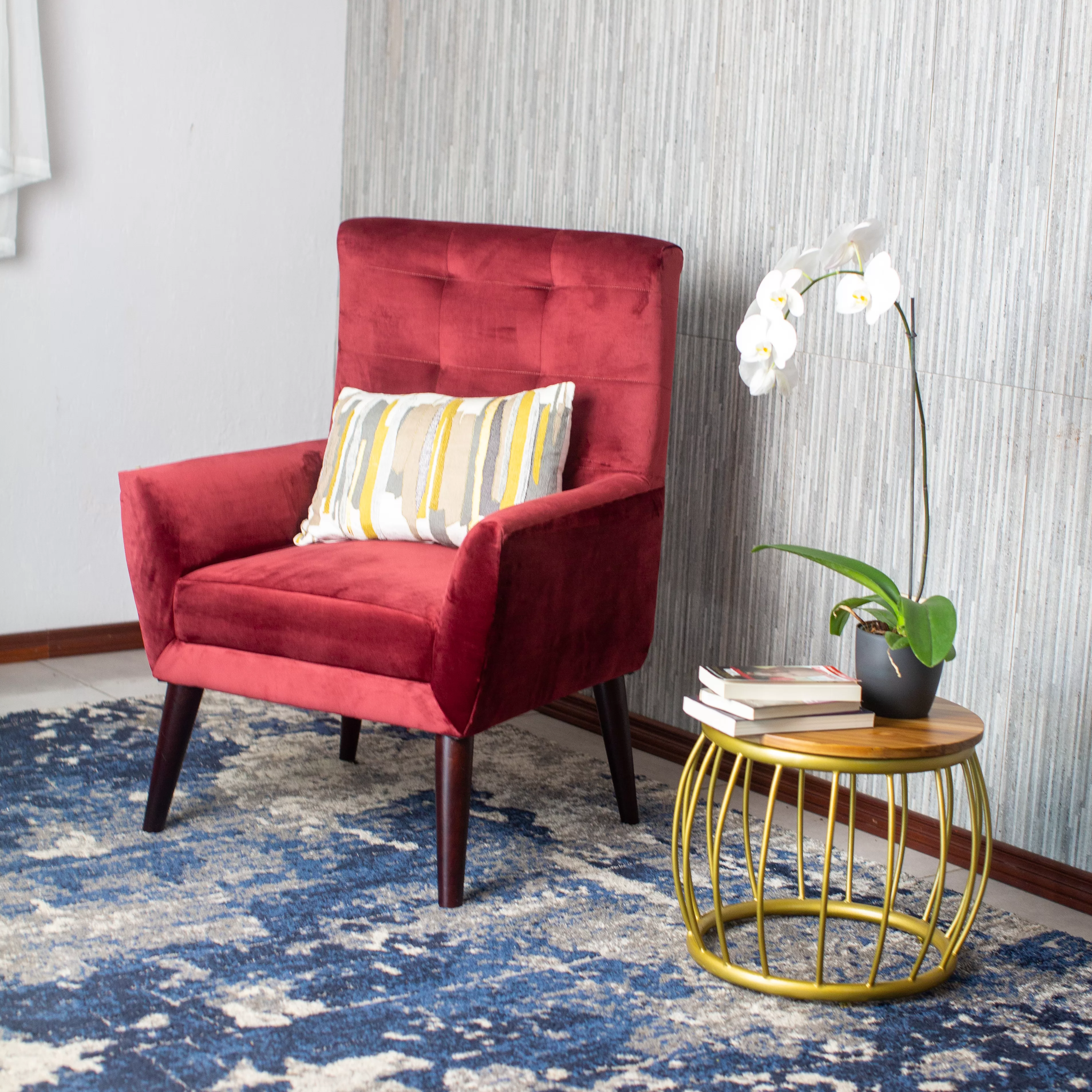 La butaca Isabela se caracteriza por su silueta estilizada y respaldo alto, ideal para quienes buscan una pieza compacta pero con presencia. Su diseño vertical aporta elegancia visual y funcionalidad en espacios reducidos, convirtiéndola en una opción ideal para rincones de lectura, recibidores o dormitorios con estilo.